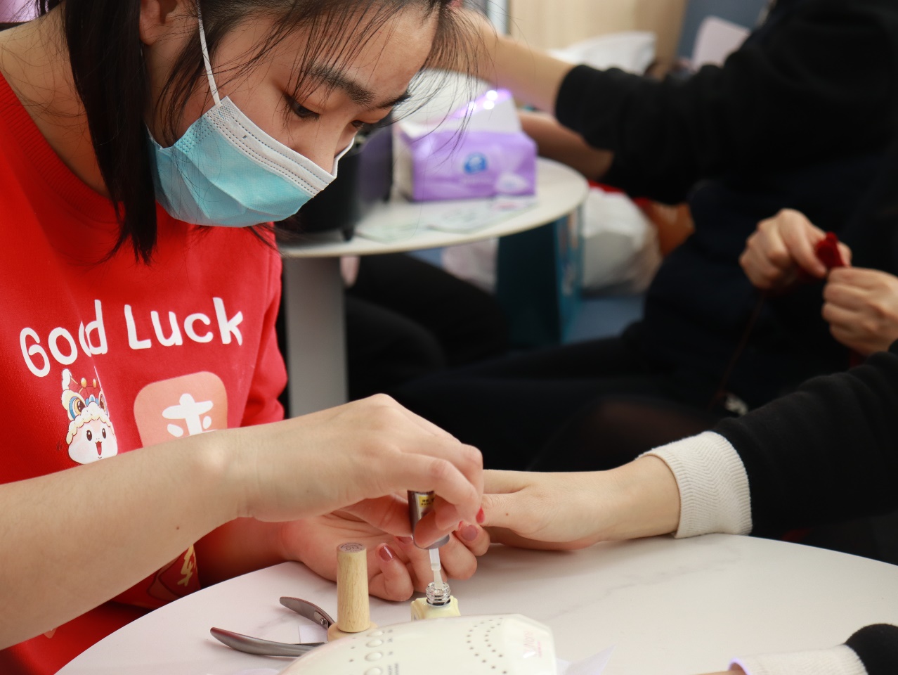 活动一开始,经管楼1205活动室里就充满了欢声笑语。桌上整齐地摆放着各种绒花体验的工具。绒花始于唐代,谐音“荣华”,寓有吉祥、祝福之意,是民间艺术的瑰宝。教职工们围坐在一起,认真聆听老师介绍绒花的历史渊源、文化寓意以及制作工艺。随后,在老师的悉心指导下,教职工们现场体验了绒花制作,进一步体会到了非遗之绒花所具备的深厚文化底蕴。活动还邀请了专业指甲护理师为女教职工们提供贴心的指甲护理服务指导,展现女性的优雅与精致。