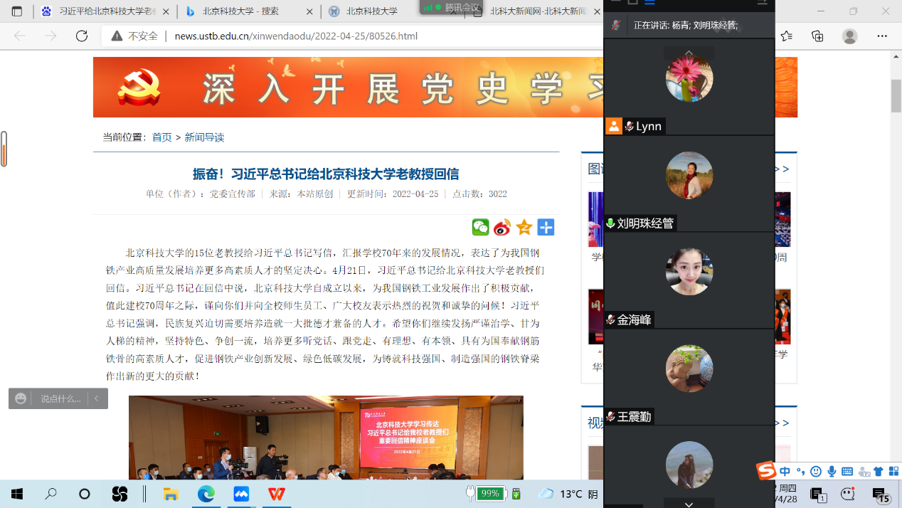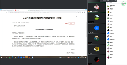 2022年4月21日,中共中央总书记、国家主席、中央军委主席习近平在学校建校70周年前夕给365英国上市官网老教授们回信,充分肯定了学校自成立以来为我国钢铁工业发展作出的积极贡献,对培养更多高素质人才,促进钢铁产业创新发展、绿色低碳发展提出殷切希望。为深入学习贯彻习近平总书记给学校老教授重要回信精神,根据学校党委统一要求和部署,365英国上市官网党委高度重视,及时组织学院全体师生党支部以线上、线下相结合的学习方式开展学习。