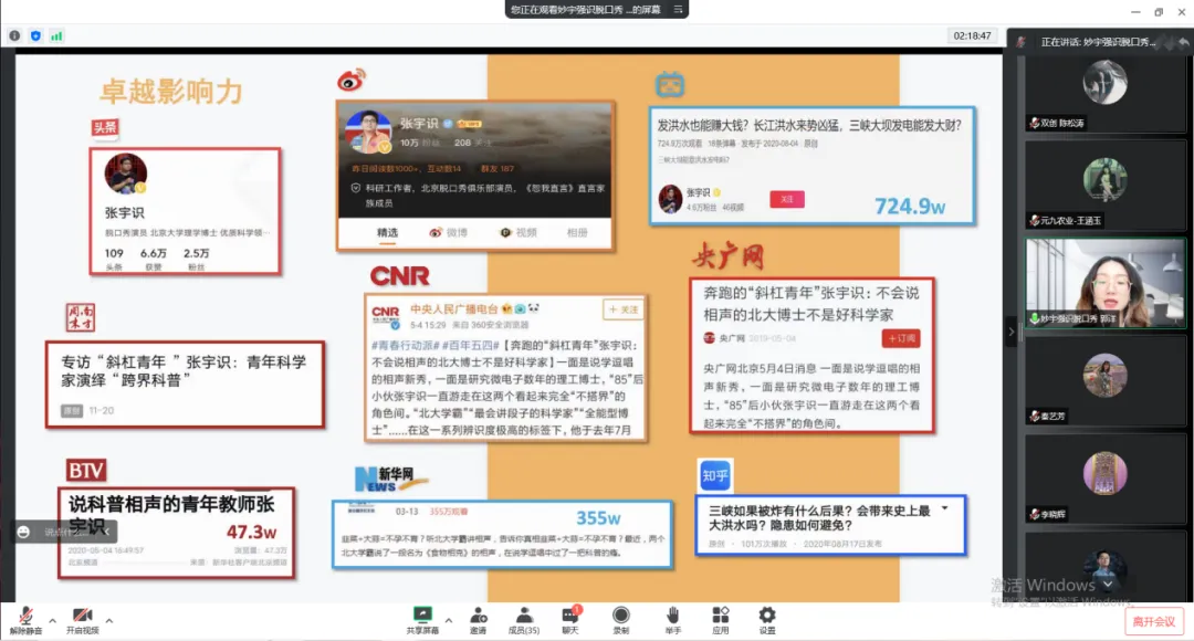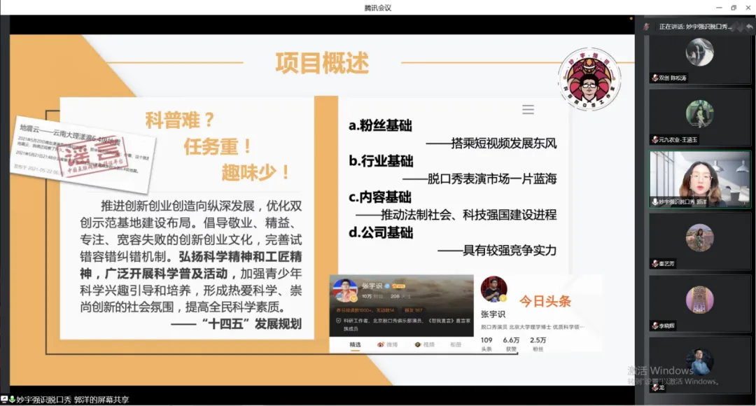 “妙宇强识”科普脱口秀工作室项目依托北科浓厚的校园文化氛围,与北科具有相关喜剧表演经验的同学合作,由周边大学向全国推广,举办脱口秀大赛等活动,选出具有突出脱口秀能力的同学,达到团队成员多层次、可持续的发展目标。各位专家老师对其运营内容的新颖性与创新性给予肯定,并详细询问了该项目接下来的活动内容,对该公司的活动策划给出了建议与想法,助力该项目活动的进一步展开,帮助该团队更快达到项目发展的目标。