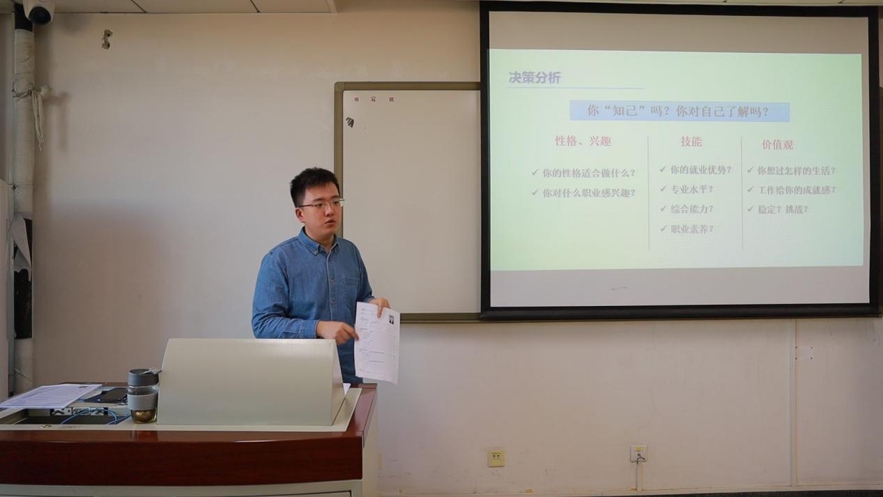 深入剖析,何择问心。张洪榛导员在冯子函学长所讲内容的基础上为同学们进行决策分析。知己知彼,方能运筹帷幄。张导从“知己”与“知彼”两个方面进行阐述与解析。所谓“知己”,即是从内心出发、从能力出发、从恒心出发,无论哪种方向都需要真正确立目标、评估自身能力、心无旁骛而进;所谓“知彼”,即是于环境明辨,于整体明辨,于竞争明辨,各种外部因素都有特定的形势、特定的范围、特定的需求。同学们只有综合内外因素,才能做出最高效能、最大满意度的决策。