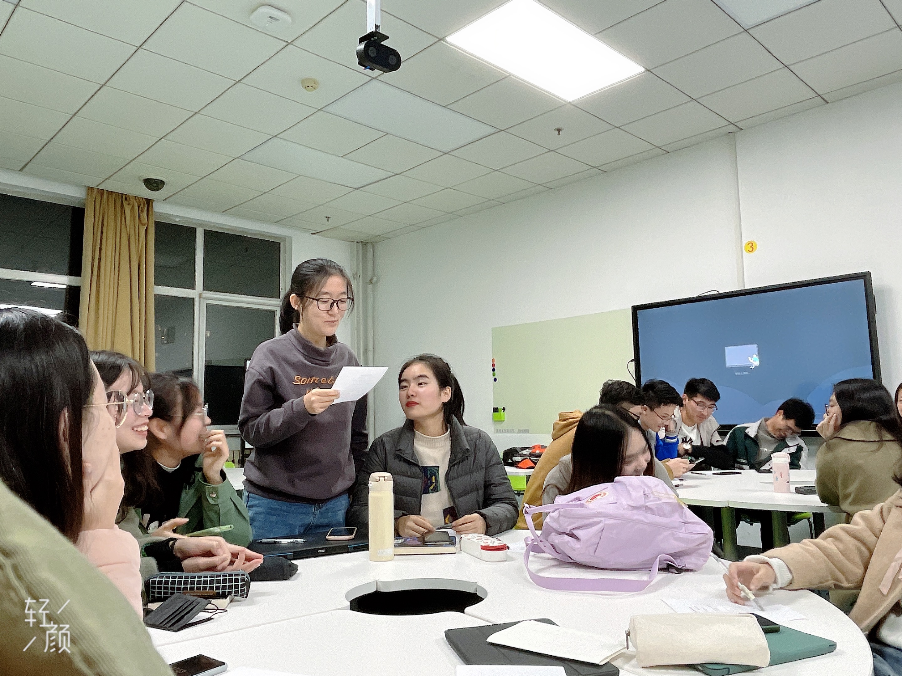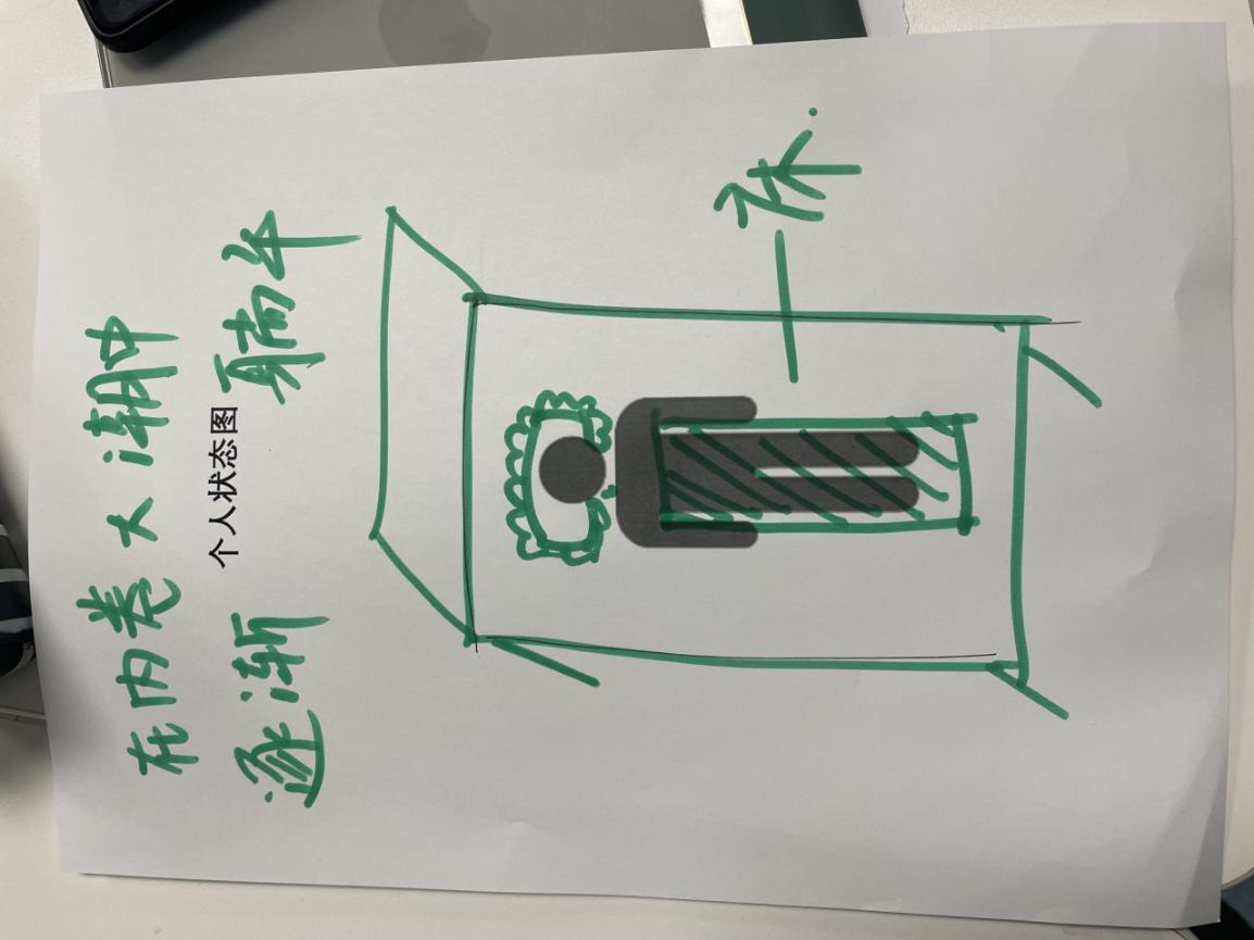 在下一个环节,“个人状态图”中,王焕琪同学又给我们每个人都发了一张印有小人的白纸,让我们根据自己最近的学习、生活、爱情状态把这张纸填充得更加丰富一些,以便自己对前一段时间个人的各方面情况和状态进行总结,并且加深自我认知。同学们的“画作”丰富多彩,都从不同的侧面反映出了自己上一段时间的某些状态。有的人画了一张床,小人安详地躺在床上,并配文“在内卷大潮中逐渐躺平”,有幽默的语言反映了自己对学习和生活的焦虑和思考;有的人画了阶梯,小人通过阶梯走向的未来却是不确定的,而这一路上伴随着阳光和风雨;有的人也风趣地展示了自己在“双十一”期间疯狂剁手,钱财都带着翅膀飞走了的画面……每个人都通过这一幅图展现了出了自己认为的如今生活最有存在感的画面,同时令人不禁思考,未来的自己会是什么样。
