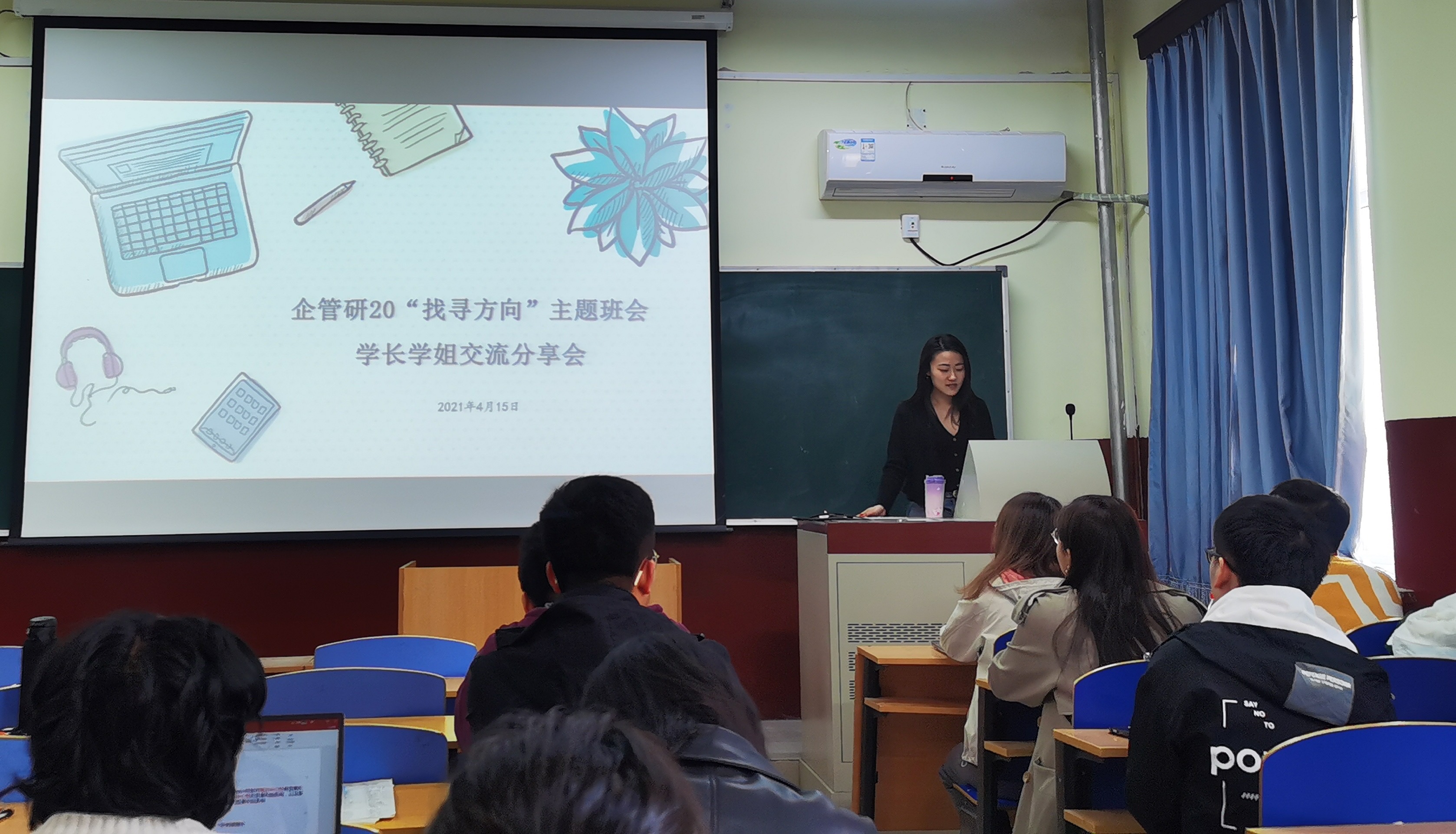 4月15上午10点,企管研20“找寻方向”主题班会暨学长学姐交流分享会于365英国上市官网管庄校区教学楼203举办,分享会由辅导员李响主持,企管专业的楚中柱、李柱等学长学姐与企管研20级全体学生参会。