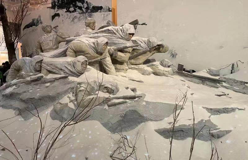 展览围绕弘扬爱国主义精神和革命英雄主义精神的主题,陈列着在抗美援朝战争中志愿军战士们使用的装备和物品,通过图文并茂和实物场景等方式,全面地回顾了抗美援朝战争的光辉历程,生动展示了中国人民志愿军的革命精神与英雄事迹。在展厅的上空悬挂着100面抗美援朝参战单位的旗帜,还有在大雪之中匍匐坚守了一夜的志愿军雕像,每一场战争、每一个事迹无不震撼并鼓舞着在场的每一位同志。