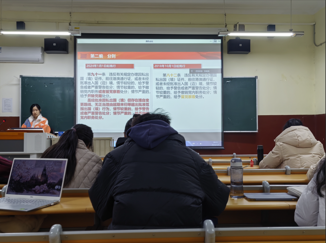 之后,张晓涛同志向支部成员介绍了修订后的《中国共产党纪律处分条例》。他重点强调了党员纪律的基本要求,并对党员违法犯罪、严重败坏党的形象等违纪行为应受的处分进行逐一介绍。特别是作为会计学专业的党员,在今后可能进行的公共资金收支、税务管理、金融管理、财务会计管理等财经活动中如果有违法行为,会依法追究党纪处分。张晓涛同志指出,无论是处于学生阶段还是在未来的工作中,各支部成员都要牢记党的嘱托,时刻以一名优秀党员的标准严格要求自己,严守党的纪律,绝不触碰法律底线和道德底线,坚守心中的正义和责任。