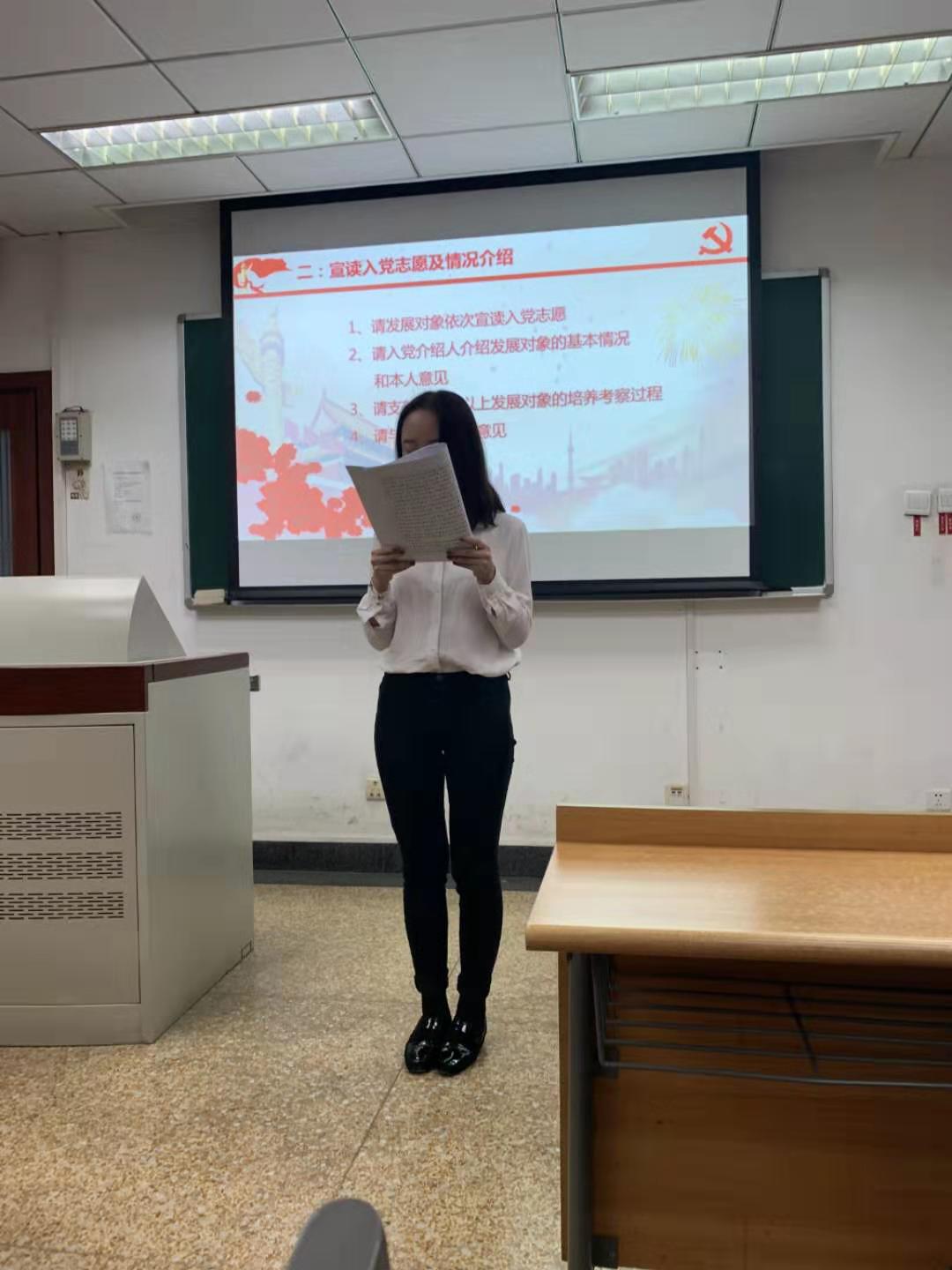 会议严格按照党组织接受预备党员程序,首先大家齐唱国际歌,紧接着各位发展对象依次宣读《入党志愿书》及情况介绍,向党组织汇报自身对党的认识、入党动机、个人经历以及在校表现等,几位发展对象认真分享自己想要加入中国共产党的原因以及自己思想的积极变化,同时都提到了要端正入党动机以及全心全意为人民服务的决心。