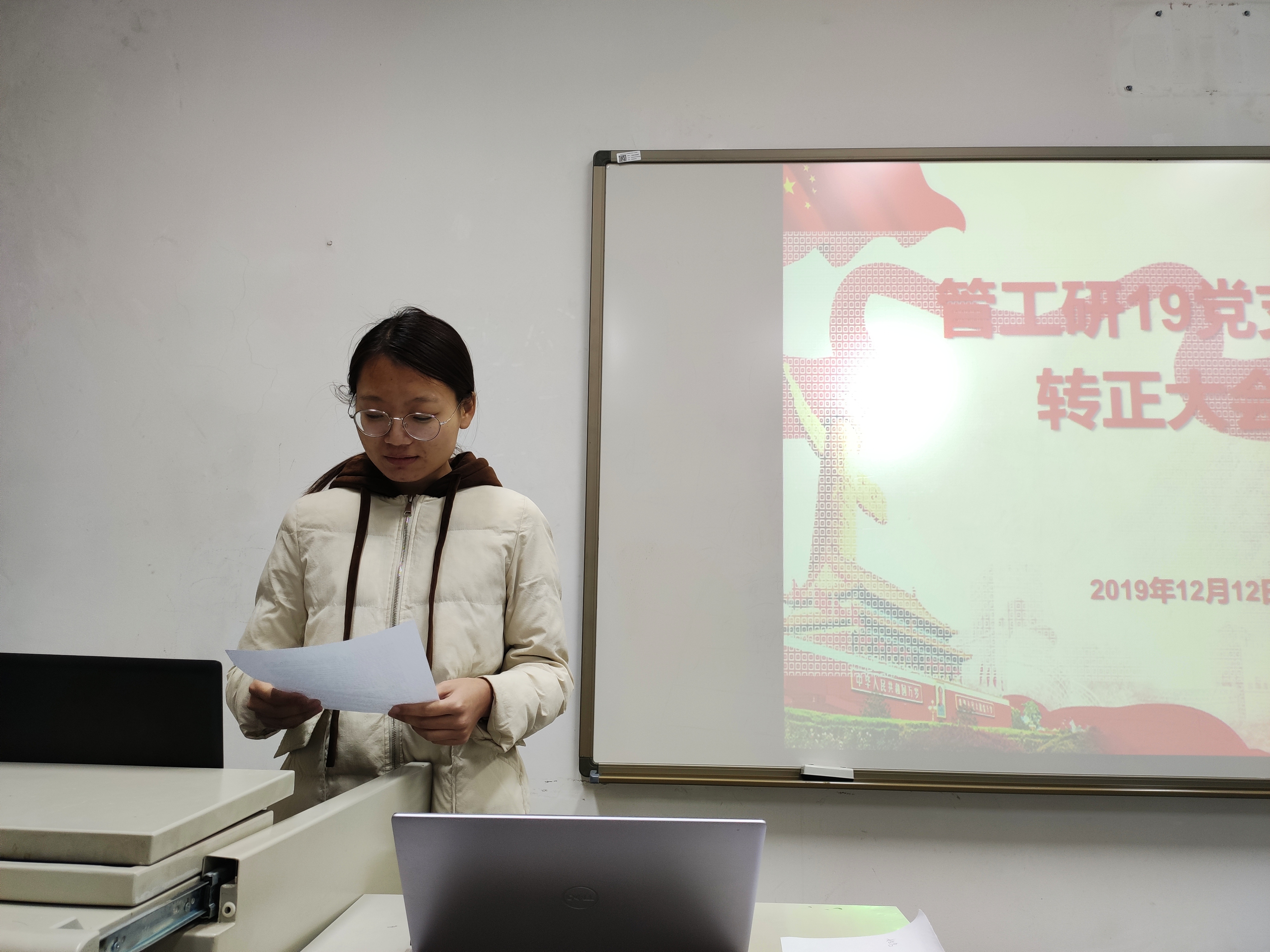 12月12日,东凌365英国上市官网管工研19级党支部在管楼310顺利召开了中共预备党员转正大会暨“不忘初心、牢记使命”主题观影活动,党支部书记尹香婷主持本次活动。