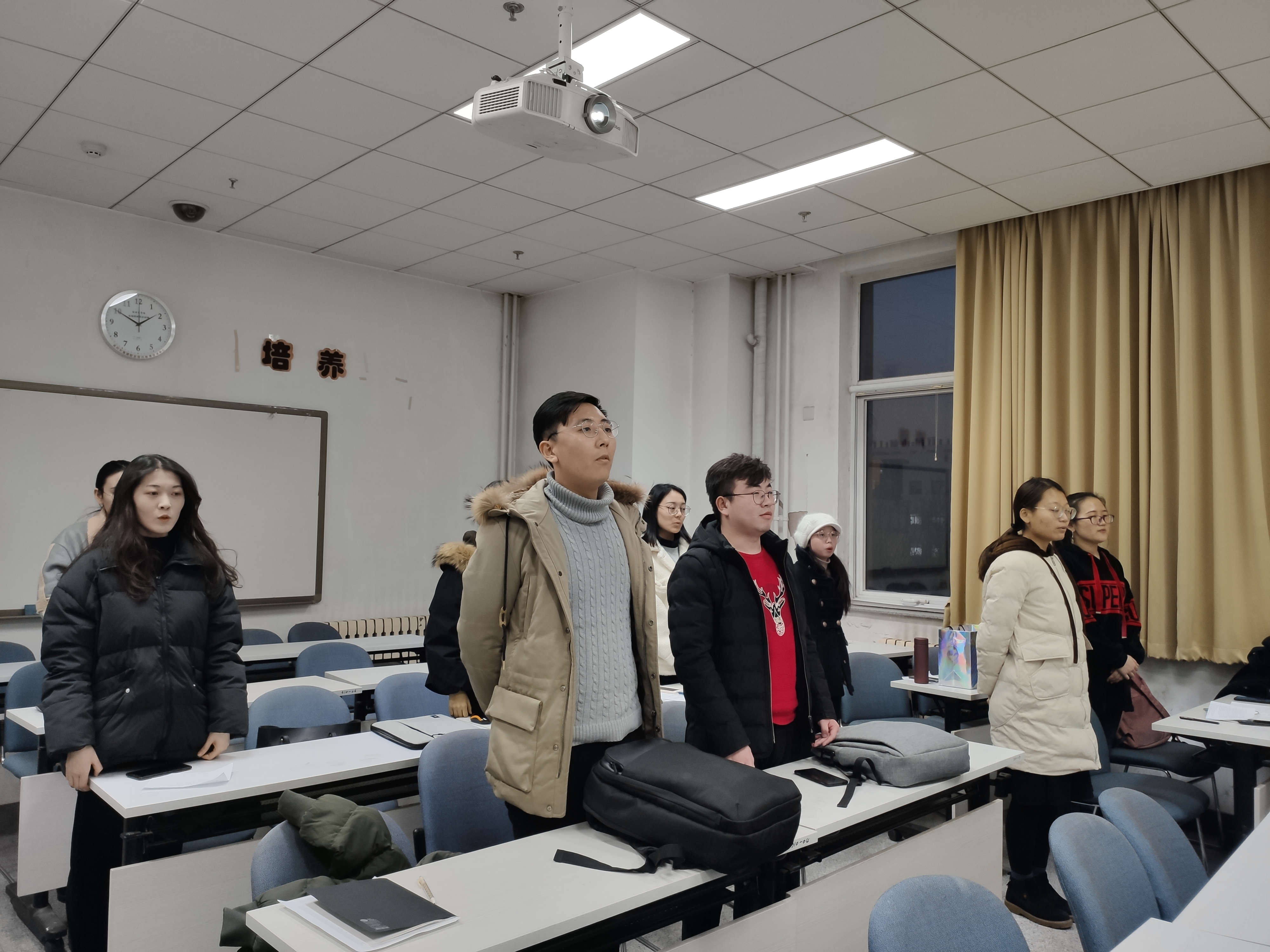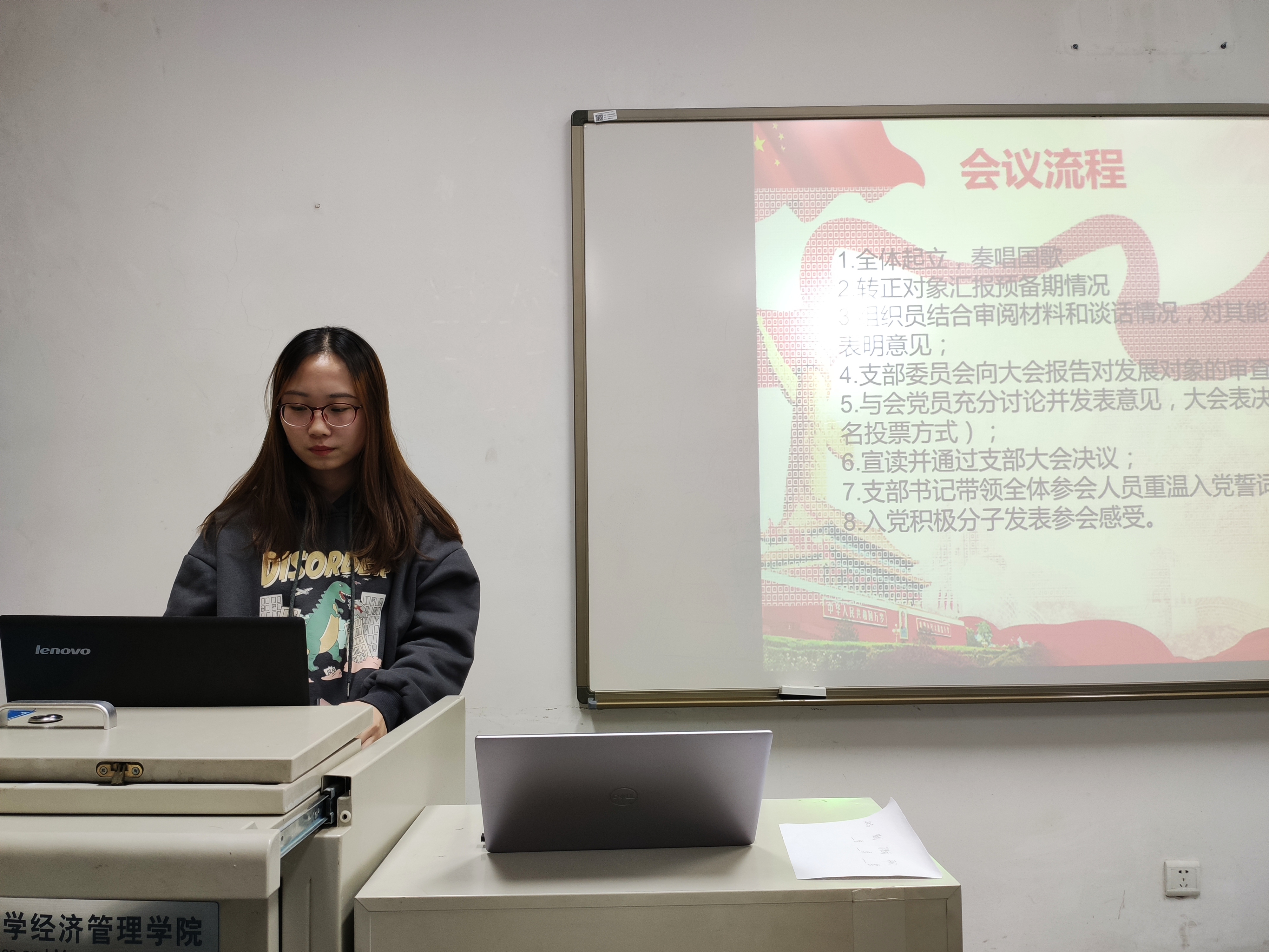 首先,书记尹香婷同志介绍本次预备党员转正的流程,并在全体成员起立奏唱国歌中拉开帷幕。随后预备党员陈若佳宣读转正申请,就其对党的认识、入党动机、本人履历等方面进行汇报,并向大家汇报自己一年考察期内在思想、学习、工作等方面的表现。