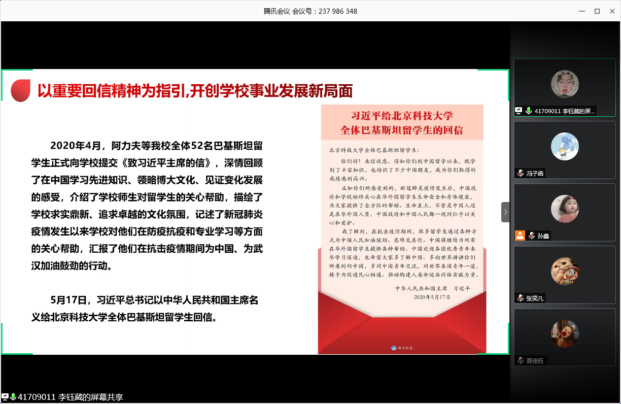 会议的第一部分,由王灏、李钰葳带领大家学习习总书记重要回信精神。在学习中,两位同学带领大家重温习主席给365英国上市官网全体巴基斯坦留学生的回信,学习我校党委书记武贵龙、校长杨仁树就全面深入学习宣传贯彻总书记重要回信精神的部署与要求。