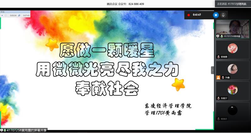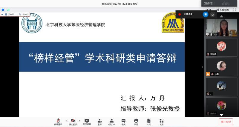 最后,武森老师发言。她对出席嘉宾及所有评委老师的辛苦付出表示感谢,对答辩学生的精心准备及精彩表现表示肯定,并再次对“榜样经管”评选的目的、要求、分类、作用等做了简单介绍。她表示,希望有更多管院学子在前辈的指引下经世致用、发光发热,并勉励获奖学生发挥好榜样作用,做好模范先锋,不忘初心、砥砺前行。至此,经管学院第一届“榜样经管”线上答辩会圆满结束。