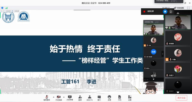 为进一步发挥学生榜样模范带头作用,引导和激励大学生不忘初心,锐意进取,经管学院于2020年正式启动“榜样经管”评选活动。“榜样经管”作为学院的最高荣誉,每年评审一次,授予本年度在学术科研、创新创业、道德风尚、学生工作等方面表现突出的学生。5月25日晚,首届评审答辩会顺利举办,学校学工部相关领导、学院领导与各系教师代表出席活动。