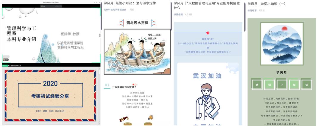 结合学院育才特点,提倡学生博闻广知。经管学院学科类型多样,要求学生成长为既专又博的复合型人才。因此学院学辅中心注重学生认知的横向扩展,开设“经管小知识”、“诗词小知识”专栏,向学生们普及生活中生动有趣的经管知识和诗词传统文化,提高理论积累,压实文化底蕴。制作“抗疫期间,我的专业能做什么”系列推送,结合时代热点提升学生专业认知。开展“系主任专业介绍会”、“毕业生保研、考研、出国经验分享会”等经验分享讲座,助力学生发展指导。