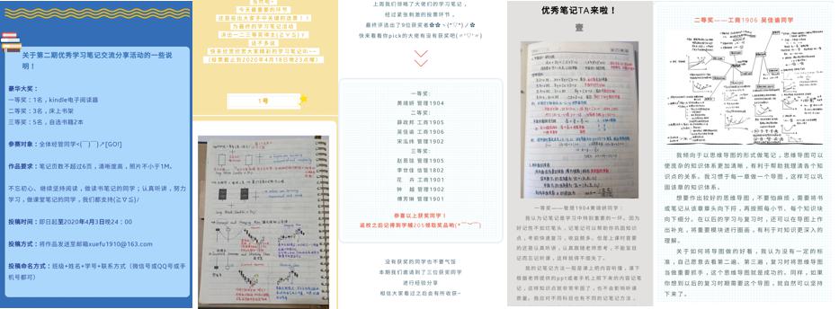加强优秀作品宣传,帮助学生厚积以薄发。学习笔记是学生“学而时习之”的有力法宝,一份优秀的笔记更是学生知识积累的珍贵结晶。学院学辅中心大力支持学生记录笔记,开展读书笔记评比活动两期。第二期学习笔记评比中一等奖获得者黄婧妍说:“学而不思则罔,思而不学则殆。我们要在记笔记中思考,将笔记作为辅助,这样学习会更上一层楼。”“学风建设月”期间学院学辅中心共收集投稿笔记百余篇,评选出九篇优秀笔记并进行笔记记录心得分享,传递实用经验,让更多同学乐于、善于记录笔记。