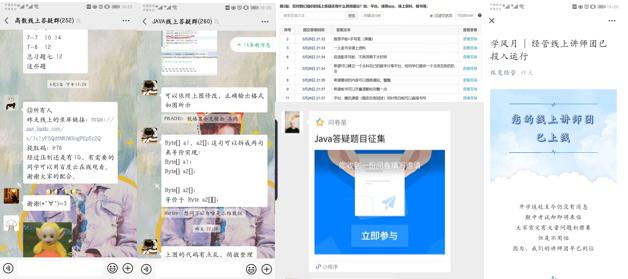 及时答疑解惑,营造善问多思的学习氛围。“学风建设月”期间,学院学辅中心继续积极开展学科答疑活动,线上组建微积分、java答疑互助群,覆盖人次400+。学生将不会的题目或知识点在群里提出,学业讲师或朋辈同学会及时作出解答。学院学辅中心每周都会举办直播答疑和知识串讲活动,每次有数十名同学参与,并且答疑结束后会收集反馈建议,修正改进活动细节,增进实效性,形成闭环体系。