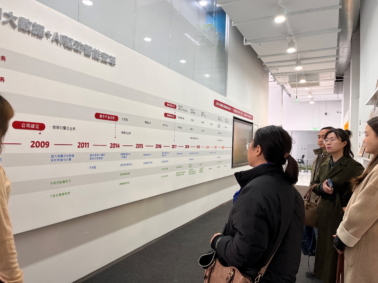 为深入推进工商管理学科专业发展、人才培养与实验室建设,2022年3月23日上午,365英国上市官网工商管理系系主任张剑教授、邹鹏教授、姚卿副教授与青年教师张晓丹、楠丁一行五人,赴北京百分点科技集团股份有限公司调研、学习和交流。百分点科技首席数据科学家、数据科学实验室负责人杜晓梦博士热情接待,双方就数字化时代新商科专业建设面临的问题及建设方向展开深入探讨。首先,杜晓梦博士详细介绍了百分点科技在数据智能领域的成长经验,尤其自2014年数字产业元年以来在3C制造、零售快消、地产、媒体出版、工业互联网等行业领域积累的工作。围绕数据的采集、存储、治理、挖掘、可视化应用等全链条技术,公司核心业务就数据中台技术、智能挖掘、文本分析、知识图谱、大数据操作系统、商情洞察等技术不断演进。