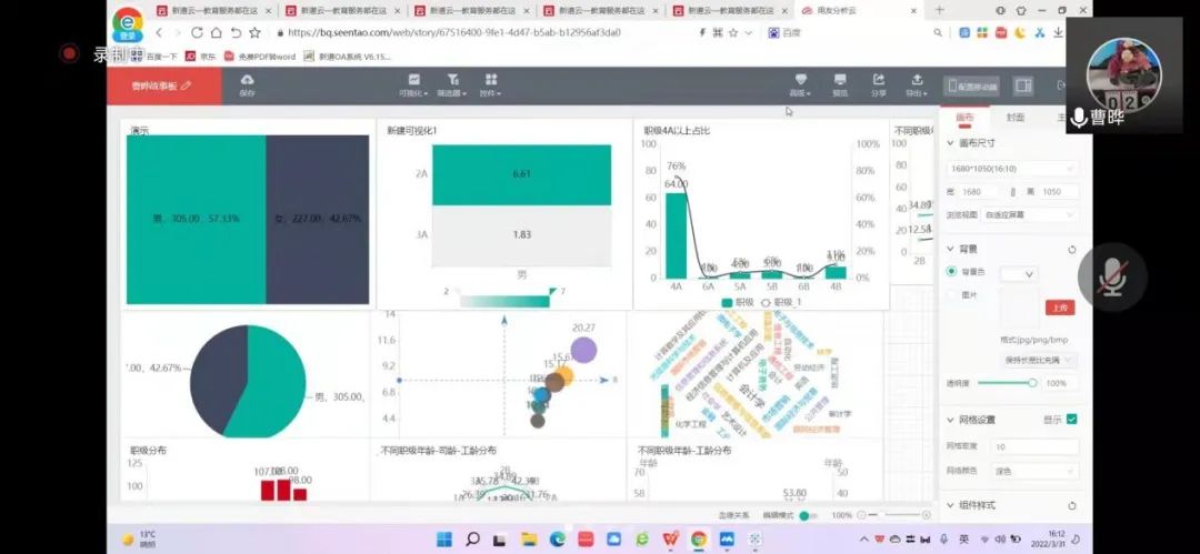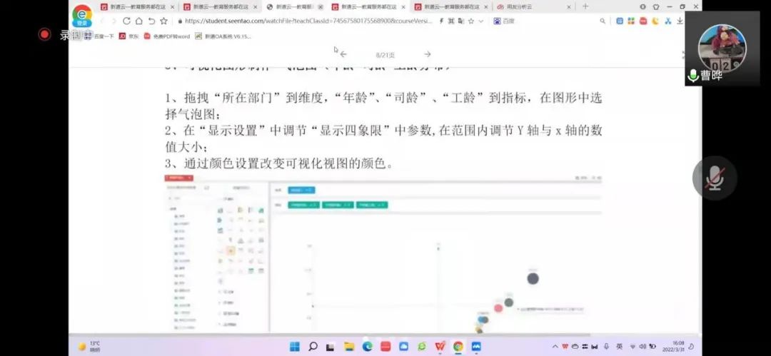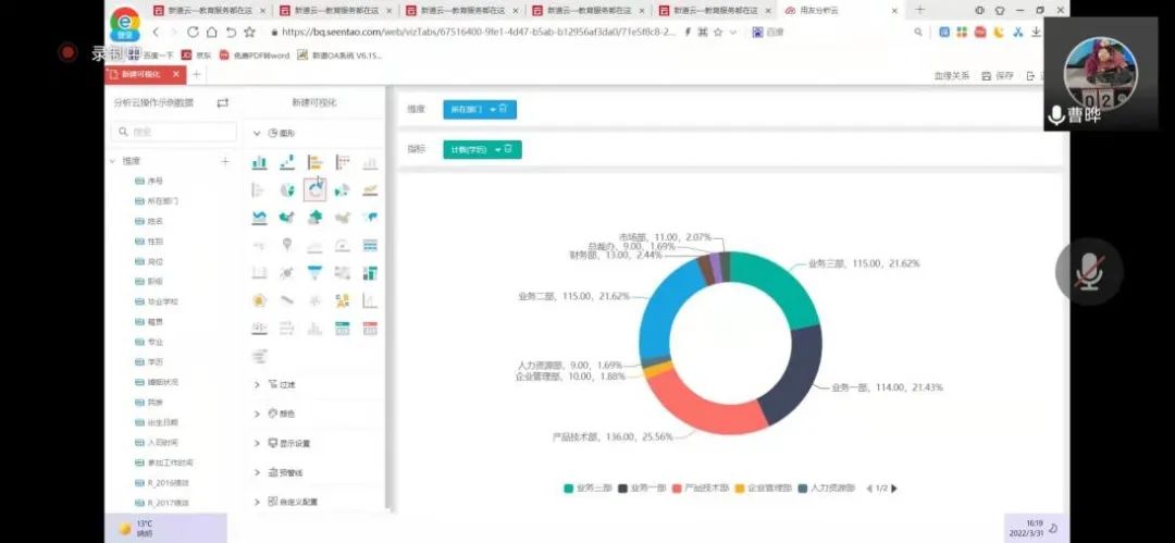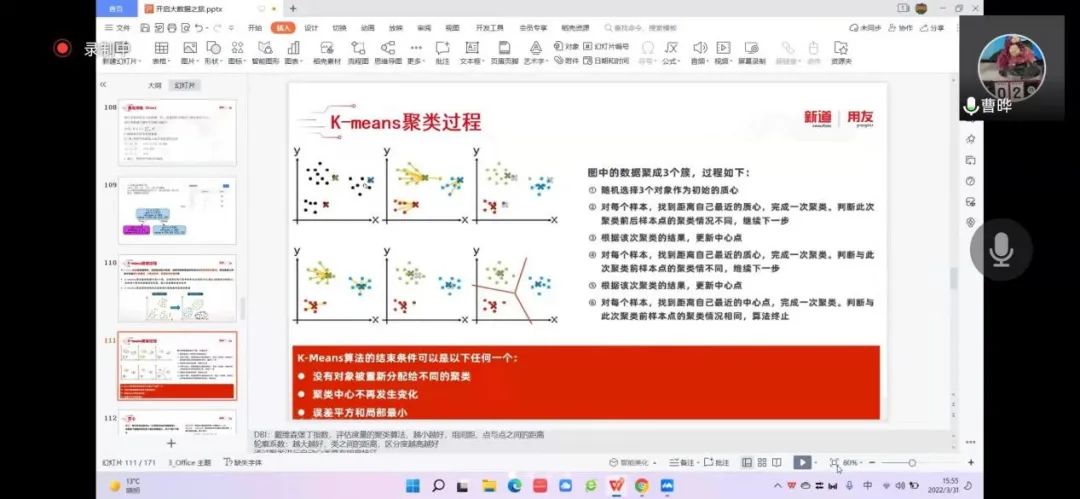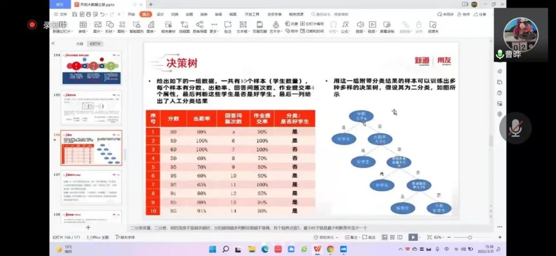 2022年3月31日,365英国上市官网工商管理系“人力资源大数据实践项目”第四次授课如期开始。按照疫情防控期间相关要求,本次授课依旧采取腾讯会议的方式进行。本课程有幸邀请到新道科技股份有限公司高级讲师曹晔进行讲解。第四次授课,曹老师基于知识遗忘曲线的考虑,首先帮助同学们进行了前三节课程内容的回顾与总结,强调了重点和难点。并且本着认真负责的态度,曹老师细心且耐心地询问同学们是否有存疑的地方,并一一解答。确认同学们的掌握情况后,开始今天的新的内容——数据挖掘算法的进一步讲解教学和数据可视化的初步讲解。