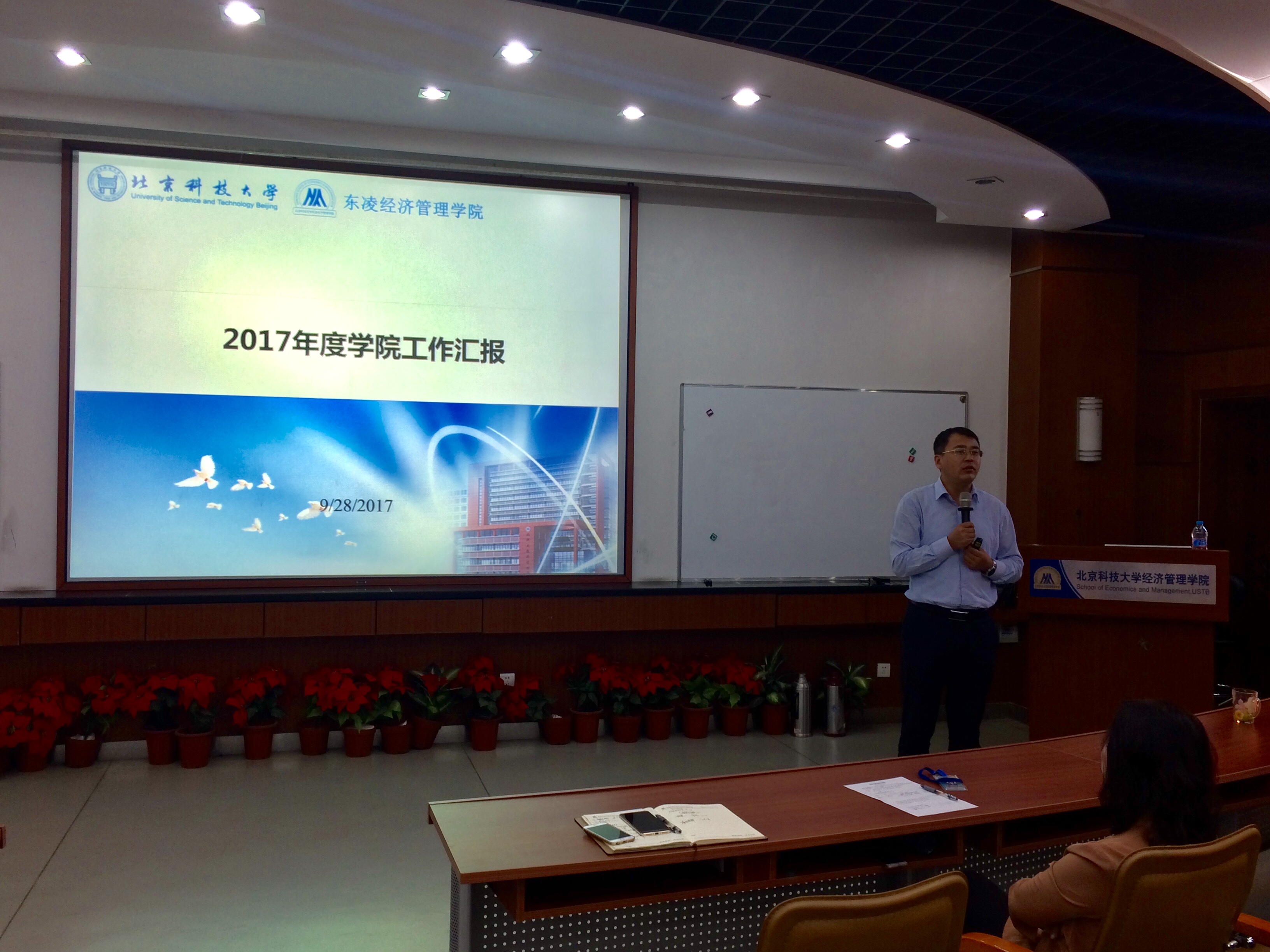 随后,院长助理兼认证办主任赵霞老师、范小华副院长、魏钧副院长分别从国际化进展情况、本科生教学工作、MBA工作三个方面进行汇报。闫相斌院长从科研工作、教学人才培养、师资队伍建设、国际化(认证)、创收工作等不同方面就2017年学院工作进展情况作详细说明。