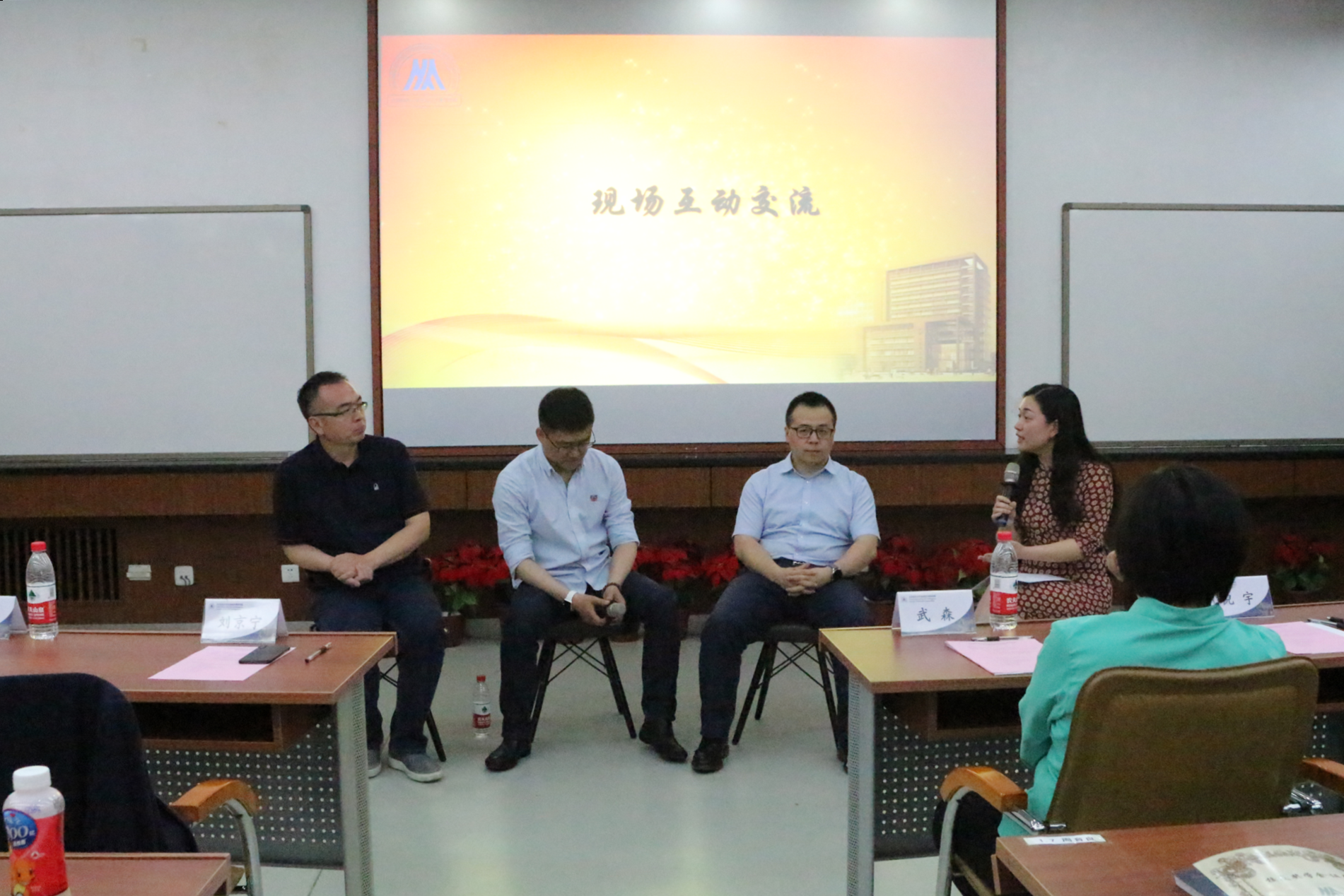 互动环节,三位校友与在场同学进行了现场交流。首先倪宇向校友问到如今大学生身上应该有怎样可贵的品质,校友们一致认为坦诚和自律是放在第一位,只有对自己严格要求,人才会有更大的自由。随后同学提问是在学校读书学习还是在社会实习实践更能体现人生价值,校友们建议同学要把握好大学的四年时间,只有打好基础,才能在社会实践中脱颖而出。校友们将多年的经历凝练成经验与道理,与同学们分享。精彩的言论和生动的事例,博得了全场的阵阵掌声。