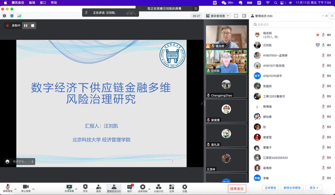 活动开始,系主任王未卿老师介绍了汪老师的主要研究方向,同时对来自南安普顿大学、杜伦大学、纽卡斯尔大学等海外其他高校的学者表示热烈欢迎。本次讲座围绕数字化转型背景下供应链金融面临的政策环境、发展趋势、凸出矛盾、与解决方案展开。面向数字技术在供应金融实践中产生的多源、混频、异构、无标签等多模态风险大数据,采用混频数据采样、自然语言处理、复杂网络优化、半监督学习等方法,系统探讨了供应链金融多维风险治理话题,为构建健康的数字供应链金融生态系统提供了思考。