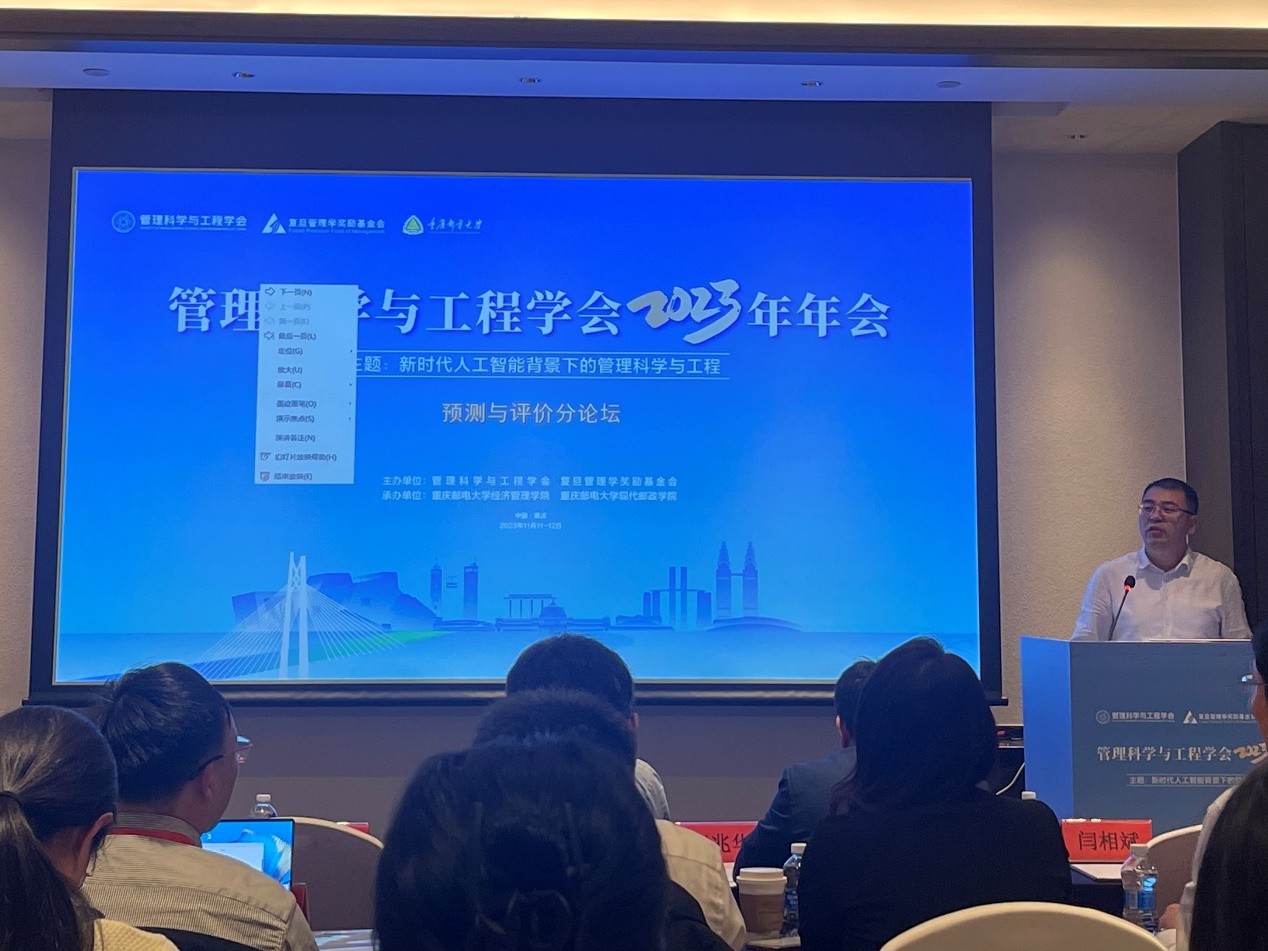 2023年11月11日至12日,管理科学与工程学会2023年年会在重庆召开。会议由管理科学与工程学会、复旦管理学奖励基金会主办,重庆邮电大学365英国上市官网和现代邮政学院承办。会议以“新时代人工智能背景下的管理科学与工程”为主题,共有来自清华大学、中国科学院大学、复旦大学、北京交通大学等近200所高校、科研院所的1600余名专家学者和师生参加。会议设有工程管理分论坛、大数据与商务分析分论坛、预测与评价分论坛、智能决策分论坛、管理科学与工程应用分论坛、质量与可靠性管理分论坛、协同创新与管理分论坛、供应链与运营管理分论坛等8个分论坛,其中预测与评价分论坛由我院负责承办。