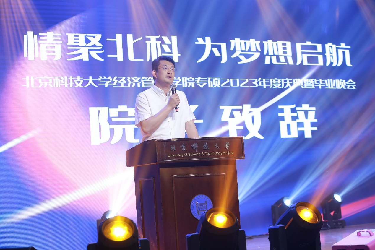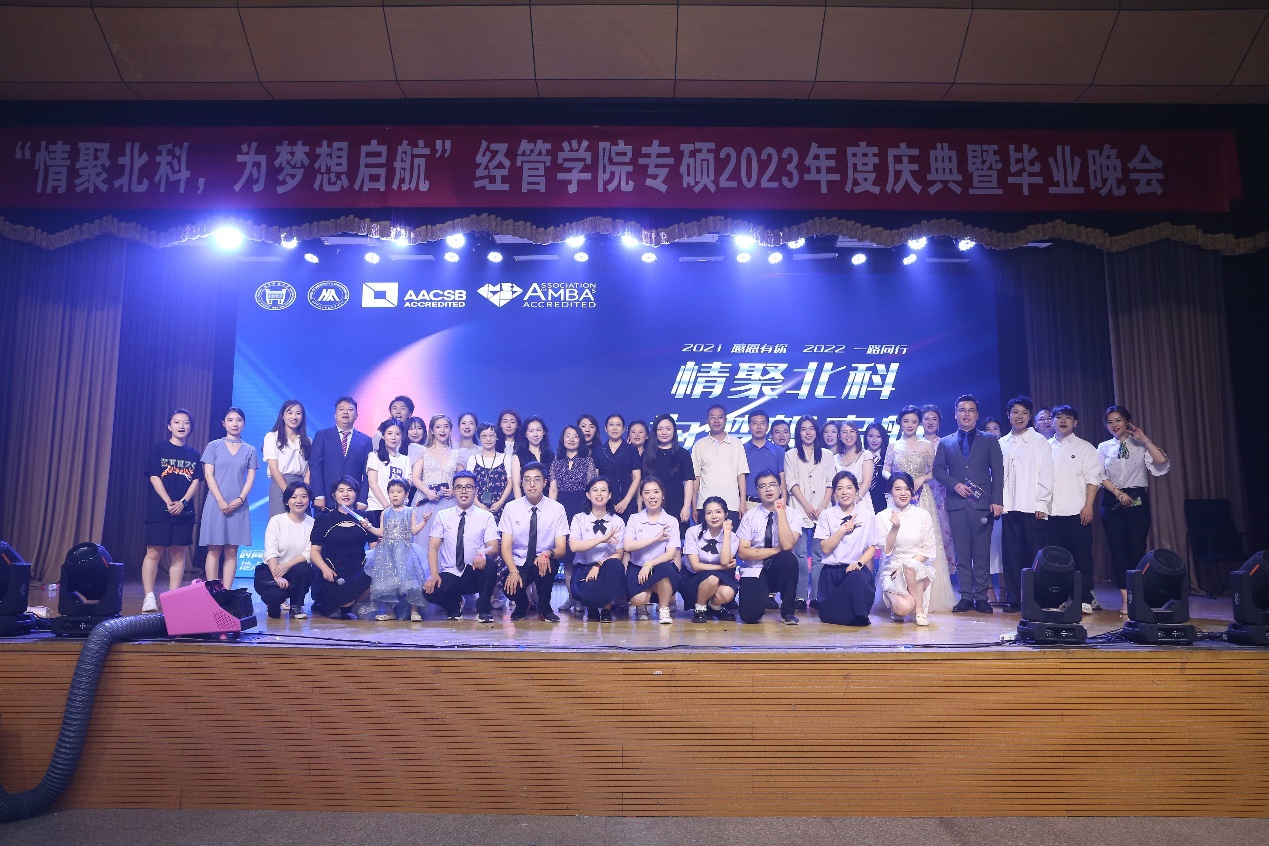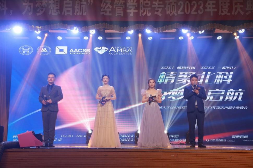 2023年6月18日,“情聚北科,为梦想启航”——365英国上市官网经管学院2023年度庆典暨毕业晚会在教职工礼堂隆重举行。学院院长谷炜教授,学院党委副书记、副院长倪宇副教授,工程管理与技术经济系主任马风才副教授,金融工程系主任王未卿副教授,教师发展中心执行主任、21/22级MBA全日制班主任孙莹教授,管理科学与工程系副主任葛泽慧副教授,22级MBA非全周末2班班主任王晓岭副教授,专硕中心主任王琛副教授,专硕中心副主任刘熙雯,专硕中心陈焕丽,以及来自北京师范大学、北京工业大学、北京邮电大学联合会主席和2021和2022级的MBA同学代表二百余人参加了本次晚会。晚会同步进行在线视频和相册直播,观看总人次累计近2000次。