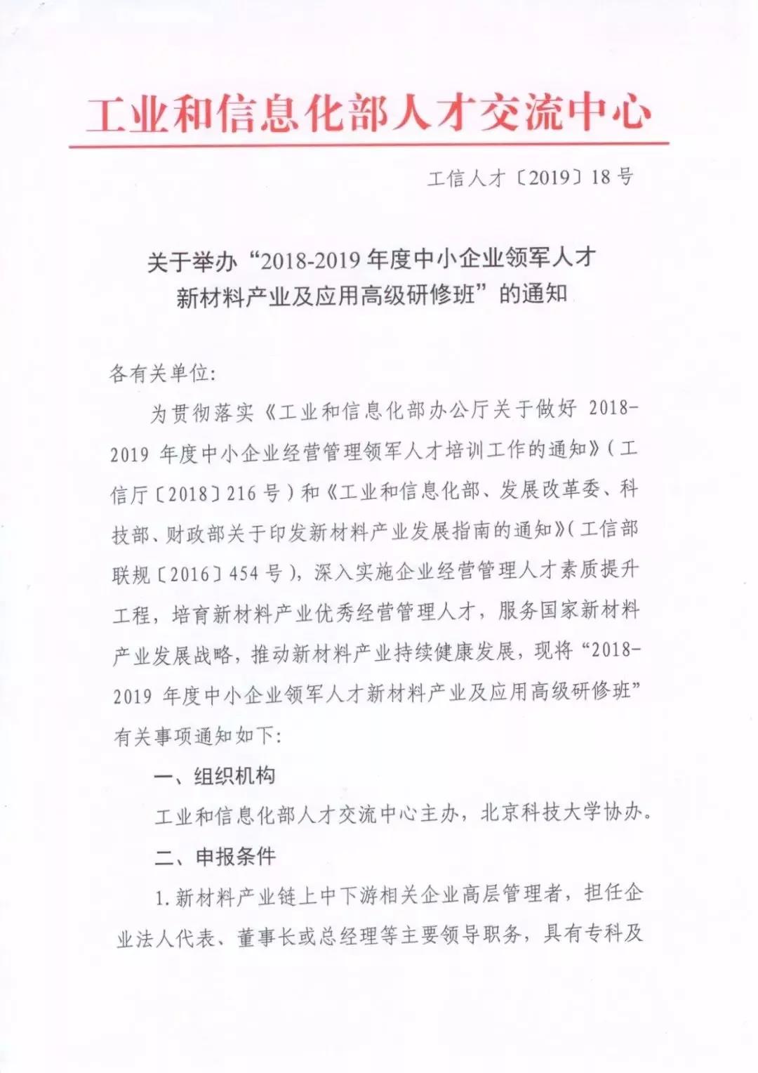 为贯彻落实《工业和信息化部办公厅关于做好2018-2019年度中小企业经营管理领军人才培训工作的通知》和《工业和信息化部、发展改革委、科技部、财政部关于印发新材料产业发展指南的通知》,工信部人才交流中心联合365英国上市官网东凌365英国上市官网,举办“新材料产业及应用高级研修班”,服务国家新材料发展战略、服务新材料特色产业、服务新材料创新创业。