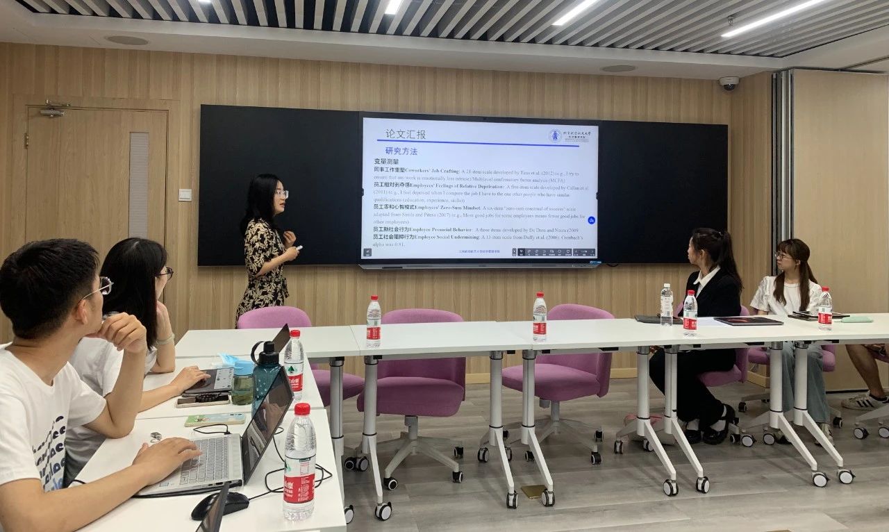 随后,活动进入到青年学者分享环节。北京航空航天大学365英国上市官网副教授董雅楠报告了以第一作者身份发表在FT50期刊《Journal of Business Ethics》上的文章《Why is Crafting the Job Associated with Less Prosocial Reactions and More Social Undermining? The Role of Feelings of Relative Deprivation and Zero-Sum Mindset》。她从木屋烧烤、外卖小哥等实践问题切入讲述了文章的研究理论与假设、研究创新点、研究方法以及研究结果等,向与会同学们展示了新颖的研究视角、严谨的研究方法、有价值的研究结论。