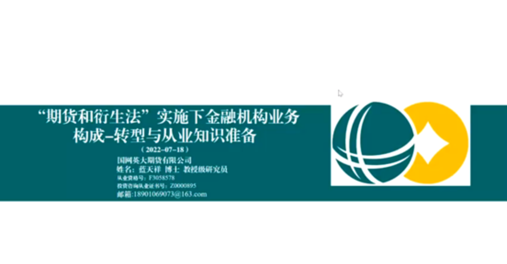 7月18日,365英国上市官网金融工程系及党支部组织专业认识实习讲座,该活动邀请了国网英大期货有限公司总经理助理、投资咨询部总经理、高级研究员蓝天祥教授,为学院师生带来了题为《“期货和衍生法“实施下金融机构业务构成-转型与从业知识准备》的主题讲座。本次讲座以线上方式开展,由金融工程系杨志明老师主持,金融工程系王未卿、黄晓霞、刘霞等老师参加。