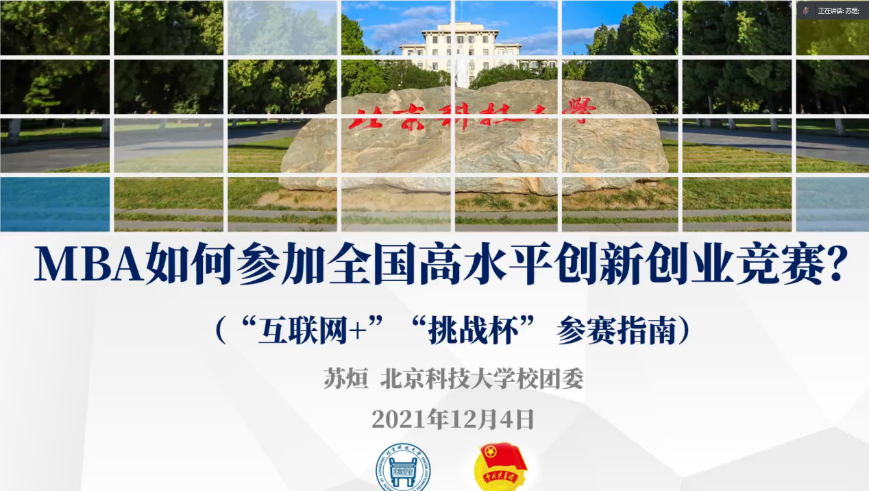 2021年12月4日晚,由经管学院专硕中心主办的“创新创业三大赛事”权威解读活动通过腾讯会议线上平台成功举办,学院创新创业辅导员戈誉阳作为讲座主持人,邀请了365英国上市官网校团委副书记苏烜老师对竞赛政策进行了专业解读,2018级MBA校友肖祥应分享了MBA参赛经验和创业经历,孟子居创业团队创始人、负责人杨国庆作为获奖团队代表分享了参赛心得。专硕中心王琛老师、陈欢老师以及近70名专硕同学共同参会。一个半小时的解读,为参会同学诠释了什么是创新创业三大赛、为什么三大赛含金量如此之高、参赛带来的众多收获,极大提高了同学们参赛热情。