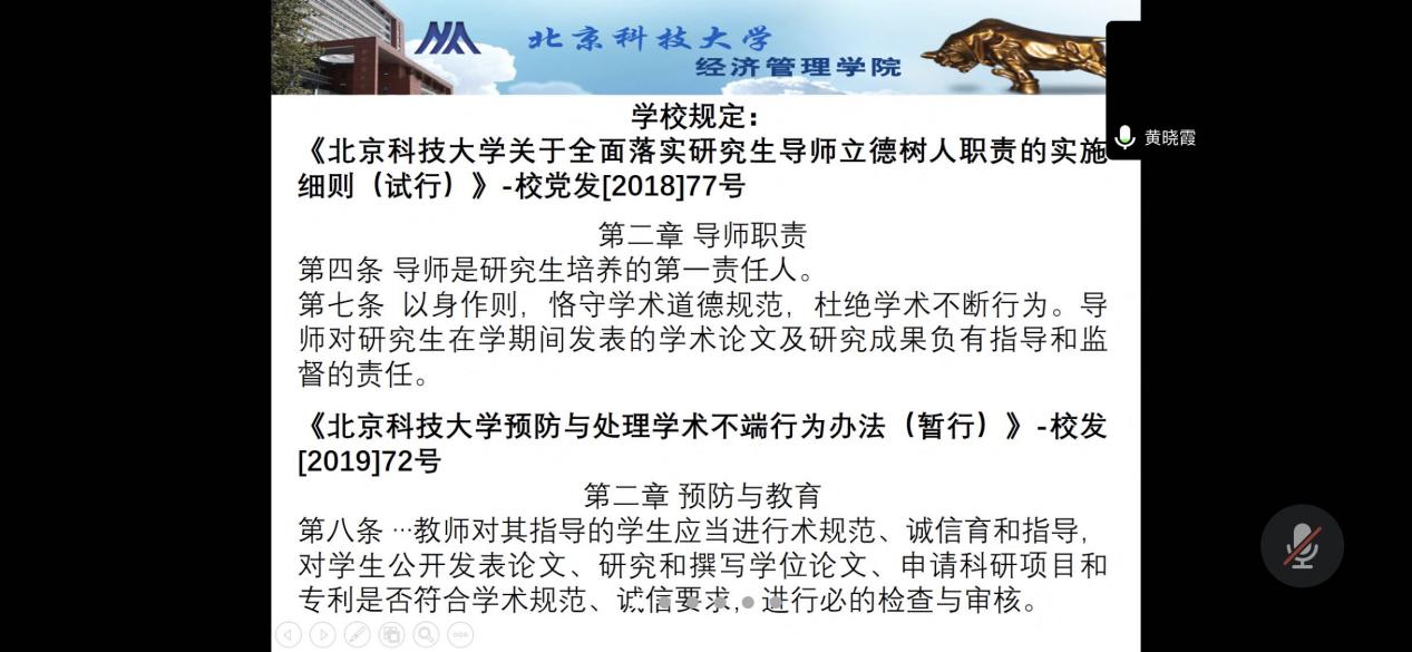 第三场讲座是由黄晓霞教授给研究生导师们作的“导师制与研究生学术道德失范预防”,黄教授从研究生导师的使命与重任讲起,强调了研究生导师在研究生培养教育中第一责任人的重要性,要求学院教师以身作则,恪守学术道德规范,杜绝学术不端的行为。
