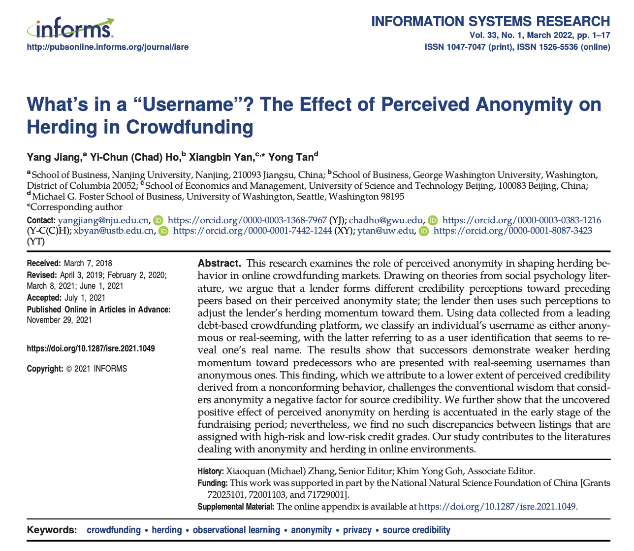 近日,我院管理科学与工程系闫相斌教授的研究成果 What’s in a “username”? The effect of perceived anonymity on herding in crowdfunding 在国际顶级期刊 Information Systems Research 发表。Information Systems Research (ISR)是 INFORMS 旗下期刊、属 UTD24 列表期刊,主要关注组织、机构、经济和社会背景下信息系统的理论及研究,是国际管理科学界公认的最高级别期刊之一。这是闫相斌教授近期在该期刊发表的第2篇学术论文,对学院管理科学与工程学科的建设具有重要意义。