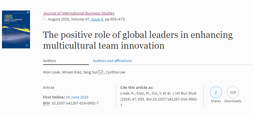 热烈祝贺我院隋杨副教授(通讯作者)的学术论文《The Positive Role of Global Leaders in Enhancing Multicultural Team Innovation》被顶级国际期刊Journal of International Business Studies收录! Journal of International Business Studies(JIBS...