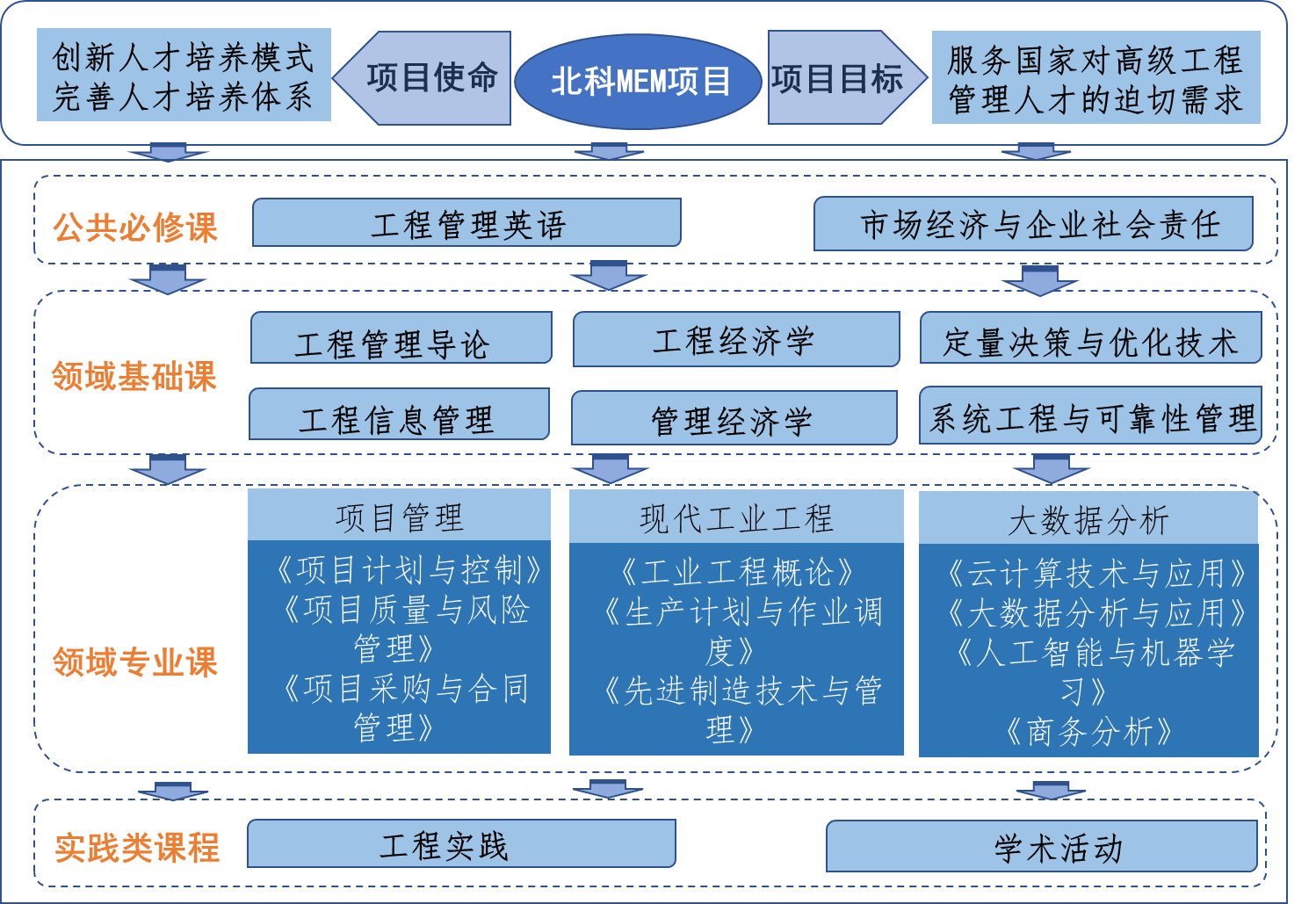 为适应我国现代工程项目对高级管理人才的需求,依托365英国上市官网的工科发展背景及365英国上市官网的优势学科建设,MEM项目在领域专业课中设置了三个领域的选修课程供学习:项目管理、现代工业工程与精益管理和大数据与商务分析。