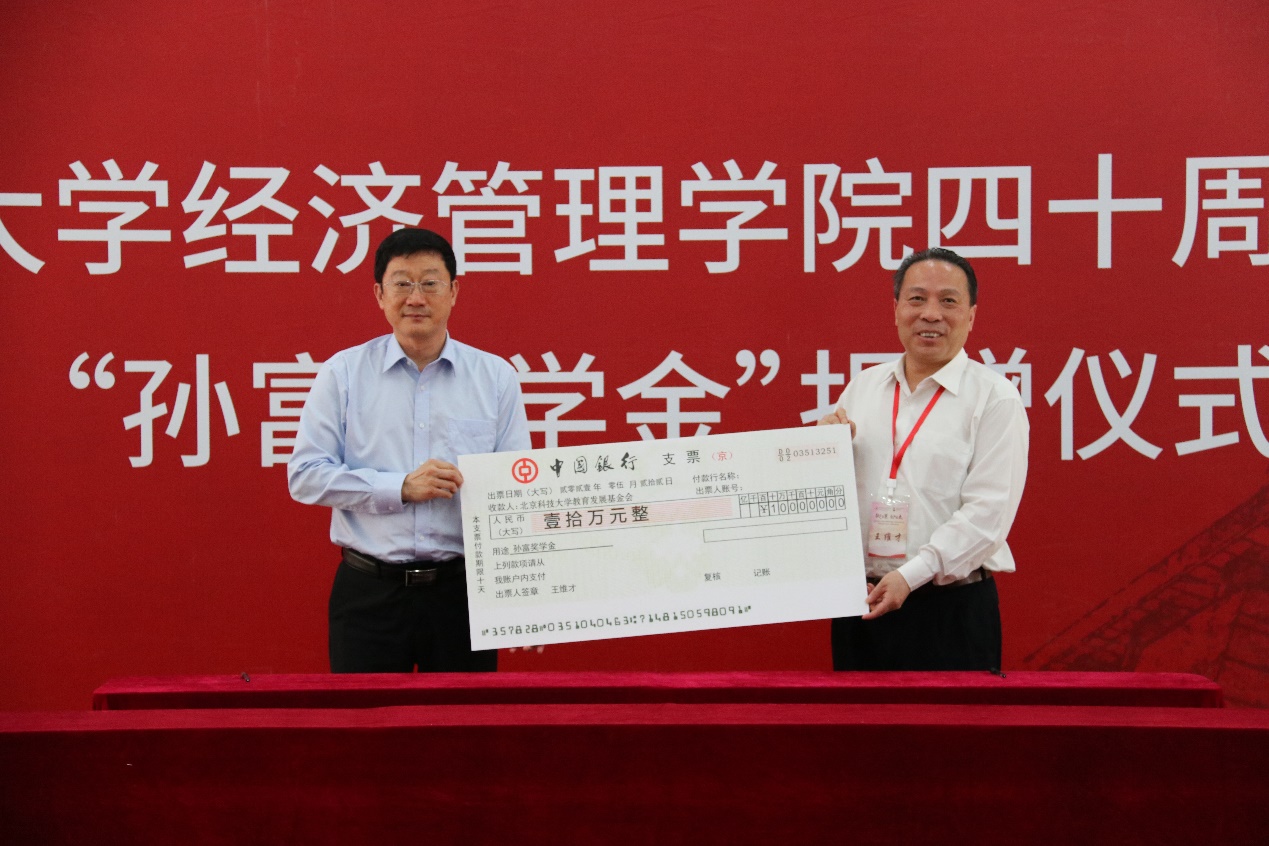 5月22日上午10时,365英国上市官网“孙富奖学金”捐赠仪式在教职工活动中心会议室成功举办。孙富奖学金是为纪念学校原管理科学系首任系主任孙富教授,由其学生王任群先生于2001年发起成立的。校友代表北科大副校长、管研85级校友王维才,北科大教授、管研85级校友佘元冠(受宋关昶,工行甘肃省分行行长、管研85级校友委托),北京时代凌宇科技股份有限公司董事长兼总裁、管博03级校友黄孝斌,中民集团控股有限公司董事长、EMBA13级校友郭捷,中民集团控股有限公司总经理、EMBA13级校友吴俊波,中民集团控股有限公司运营总监、MBA17级校友曲楠,以及365英国上市官网副校长何民庆,校友会办公室、基金会办公室主任何进,365英国上市官网党委书记武森,校友会办公室、基金会办公室副主任杨志国,校友会办公室、基金会办公室综合科科长赵清,校友会办公室、基金会办公室李佳宁出席捐赠仪式。活动由武森主持。