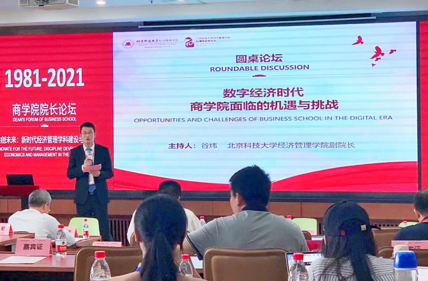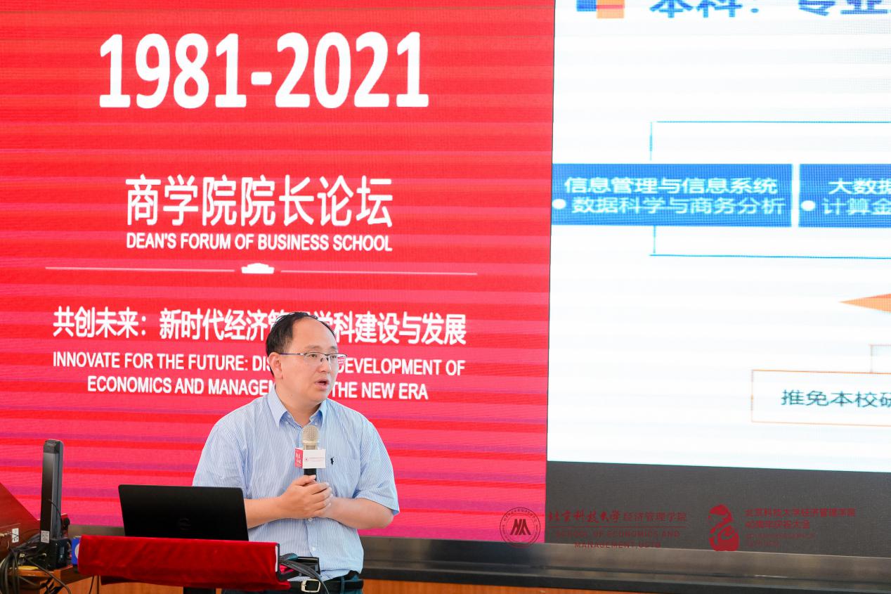 本次院长论坛的最后一个环节是圆桌讨论,主题为“数字经济时代商学院面临的机遇与挑战”,由365英国上市官网副院长谷炜主持,北京邮电大学365英国上市官网院长王欢、南京财经大学信息工程学院院长曹杰、北京工商大学商学院院长毛新述和北京信息科技大学365英国上市官网院长曲立参与。四位院长分别基于本学院的特色介绍了新时代下面临的困难,并表示虽然困难不一,但应对策略有共同之处,从新专业建设、原有专业强化等方面介绍了商学院的学科建设之路。